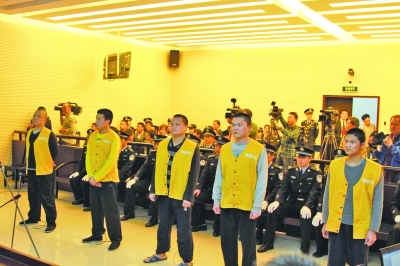 “砍刀队”成员(上图)与“菜刀队”成员(下图)接受审判。